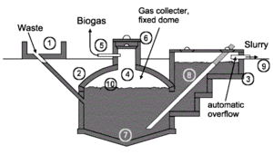 | − | + | | [[File:Nicarao biogas.gif|300px|thumb|Fixed dome plant Nicarao design<ref name="TBW">TBW</ref>''': 1. Mixing tank with inlet pipe and sand trap. 2. Digester. 3. Compensation and removal tank. 4. Gasholder. 5. Gaspipe. 6. Entry hatch, with gastight seal. 7. Accumulation of thick sludge. 8. Outlet pipe. 9. Reference level. 10. Supernatant scum, broken up by varying level.''']] | |