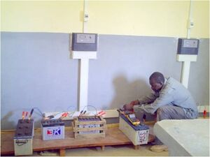 | − | <br> [[Image:Battery Terminal.jpg| | + | <br> [[Image:Battery Terminal.jpg|thumb|center|An operator of a solar battery charging station in Mali connects a battery to the charging terminal]] |