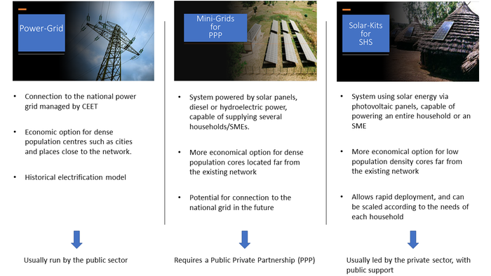 Therefore, Togo aims to use the latest technologies and business models. The electrification of the country is based on three pillars. The national power grid, Mini-Grids and Solar-kits for smart home solution (SHS).