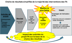La chaîne d'impact décrivant le principe de base des programmes de FA dans sa forme réduite et simplifiée (voir ci-dessus) révèle un fait important. La production d’un foyer amélioré par un artisan ou l'achat d’un foyer amélioré par un groupe cible n’apporte pas, en tant que tel, un bénéfice en matière de développement. C’est uniquement les quantités et la qualité de l'utilisation du produit qui détermineront si le FA aura un impact bénéfique sur le ménage.