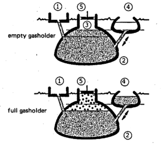 | 1.Mixing tank with inlet pipe and sand trap. 2.Digester. 3.Compensation and removal tank. 4.Gasholder. 5.Gaspipe. 6.Entry hatch, with gastight seal. 7.Accumulation of thick sludge. 8.Outlet pipe. 9.Reference level. 10.Supernatant scum, broken up by varying level. |