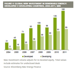 In 2011, the global investment in renewable power and fuels increased by 17% to a new record of $257 billion dollars. Significantly, developing economies made up 35% of this total investment [3].