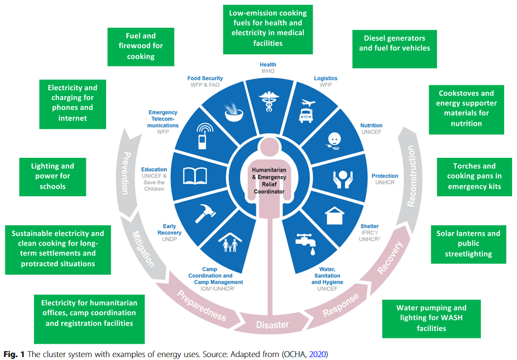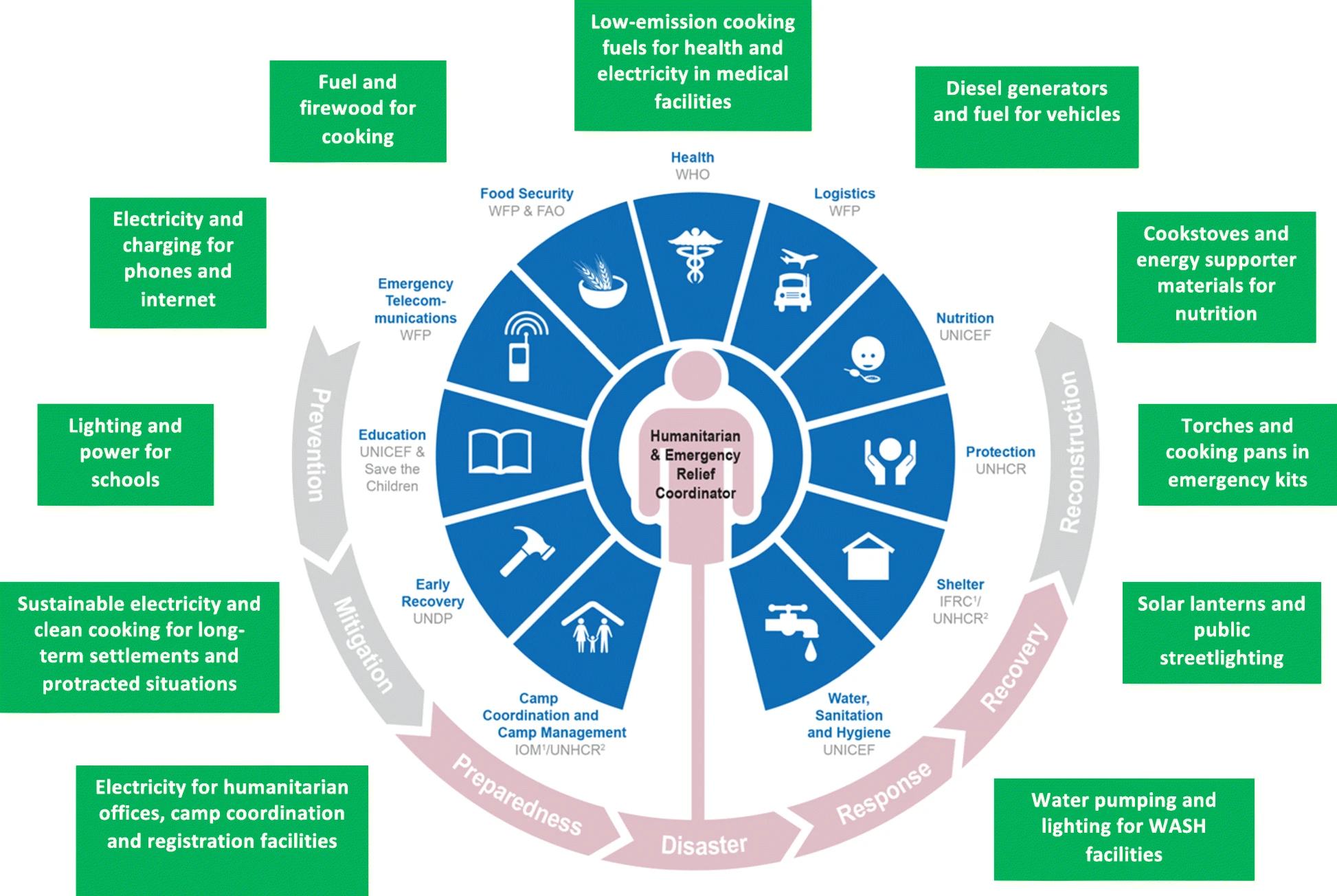 English: Examples of how energy serves as an enabler to fulfil the mandate of each cluster within the IASC Cluster System