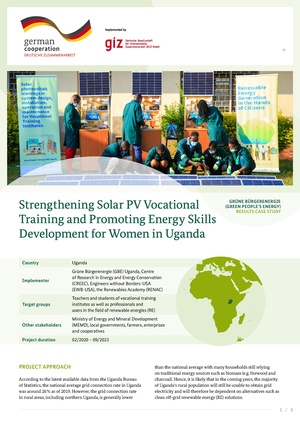 According to the latest available data from the Uganda Bureau of Statistics, the national average grid connection rate in Uganda was around 26 % as of 2019. However, the grid connection rate in rural areas, including northern Uganda, is generally lower than the national average with many households still relying on traditional energy sources such as biomass (e.g. firewood and charcoal). Hence, it is likely that in the coming years, the majority of Uganda‘s rural population will still be unable to obtain grid electricity and will therefore be dependent on alternatives such as clean off-grid renewable energy (RE) solutions. The potential for decentral RE solutions, particularly for solar energy, is high. In line with findings of the World Bank, Uganda possesses a solar energy potential of up to 200 gigawatt (GW), which is more than ten times the country‘s current installed capacity. Hence, the promotion of solar energy could also contribute to addressing the challenges of a weak economy and low incomes in Northern Uganda.The Ugandan government has recognised the potential of solar energy and has made efforts to promote its development, including support for off-grid solar projects in rural areas. Partly in cooperation with international donors, a number of mini-grids have been established - e.g. by the GIZ Pro Mini Grids Project. Despite endeavours in this regard, a skilled workforce to install new, operate, and maintain existing off-grid RE solutions is lacking in quantity and quality. What is more, women are underrepresented in the energy sector workforce, distinctively in technical and leadership roles. According to a report by the International Renewable Energy Agency (IRENA), women make up only about 20 % of the renewable energy workforce in sub-Saharan Africa. This is partly due to social and cultural factors that discourage women from pursuing careers in science, technology, engineering, and math (STEM) fields.